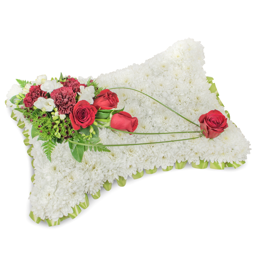 Show your compassion with our serene sympathy bouquet, thoughtfully arranged with white chrysanthemums, red roses, white freesias, and dark red carnations. Accentuated by dianthus and bear grass, this arrangement radiates elegance and grace.